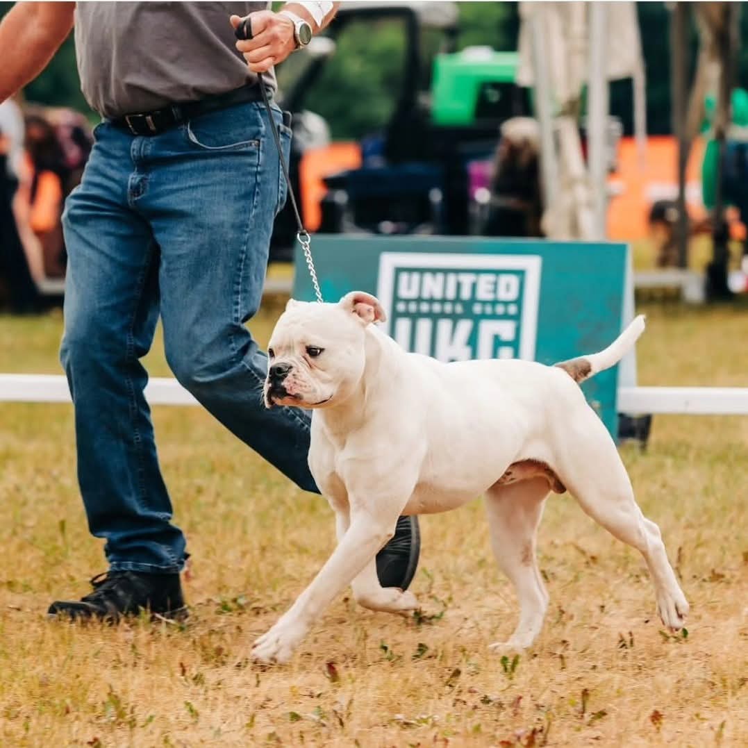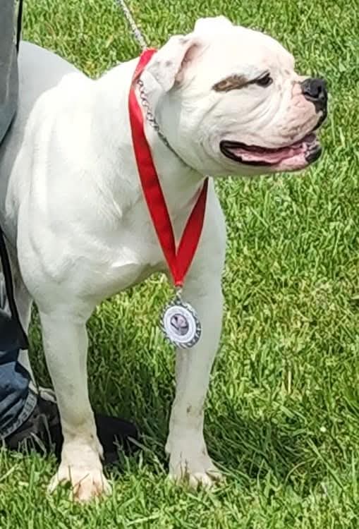 Evee is now retired from showing, working and maternal duties and ready for a wonderful retirement home. If you think you can give our girl the lifelong retirement she so deserves, please contact us at Jemm's American Bulldogs.